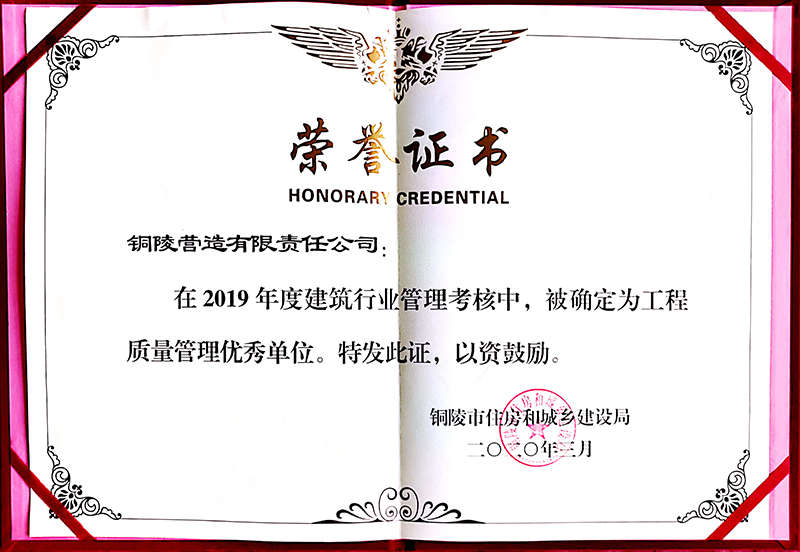 銅陵營造有限責任公司是國家住建部核準的房屋建筑總承包一級企業。2006年7月,企業二次改制為民營企業,并更名為“銅陵營造有限責任公司”。目前,公司擁有房建施工總承包、市政公用工程總承包、鋼結構專業工程承包、建筑裝修裝飾專業工程承包四項壹級資質,機電安裝、起重設備安裝、建筑幕墻三項貳級資質,地基與基礎一項叁級資質。2008年通過北京恩格威ISO9001、ISO14001和OHSAS18001“三合一”體系認證。